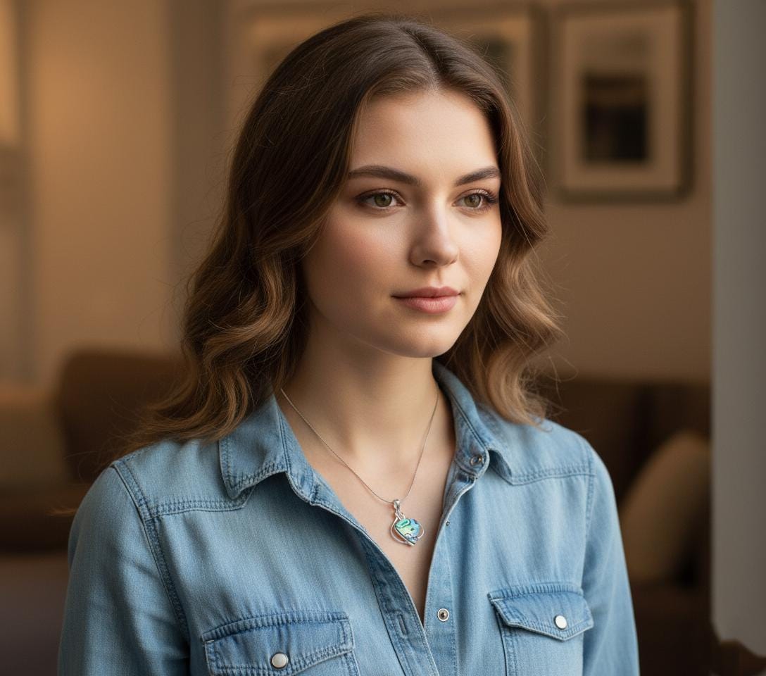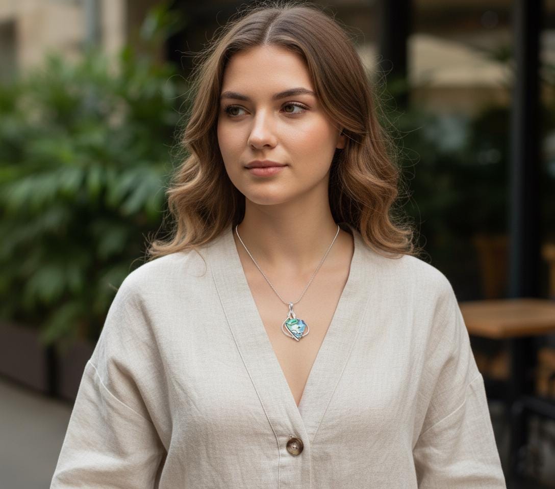 This beautiful abalone shell pendant is handcrafted in sterling silver, featuring a stunning iridescent Paua shell with shades of blue, green, and purple that shimmer like the ocean. The natural shell’s unique patterns make every pendant one-of-a-kind, giving you a truly special piece of jewelry.
