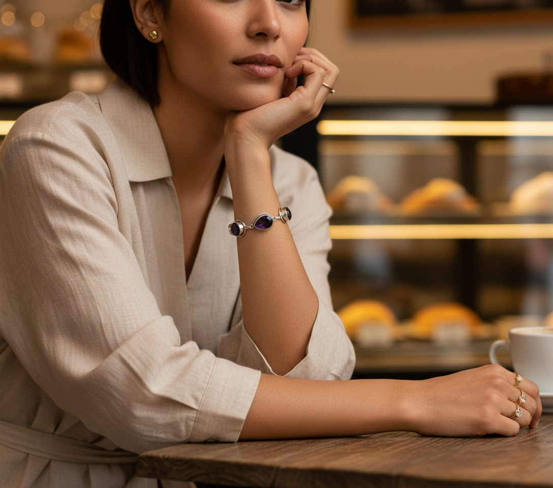 This bracelet looks incredible stacked with other pieces or worn alone as an elegant everyday luxury. The amethysts flash different shades of purple depending on the light – photos don’t do it justice!