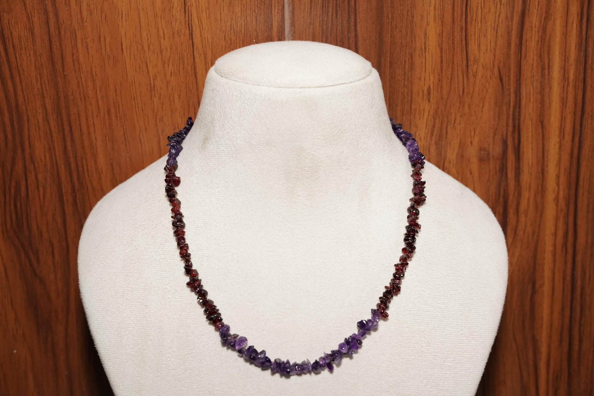 This elegant necklace is crafted with natural garnet and amethyst gemstone chips, creating a beautiful blend of deep red and rich purple tones. The warm, grounding energy of garnet harmonizes perfectly with the calming, spiritual energy of amethyst, making this piece not only a stunning accessory but also a meaningful gemstone combination.