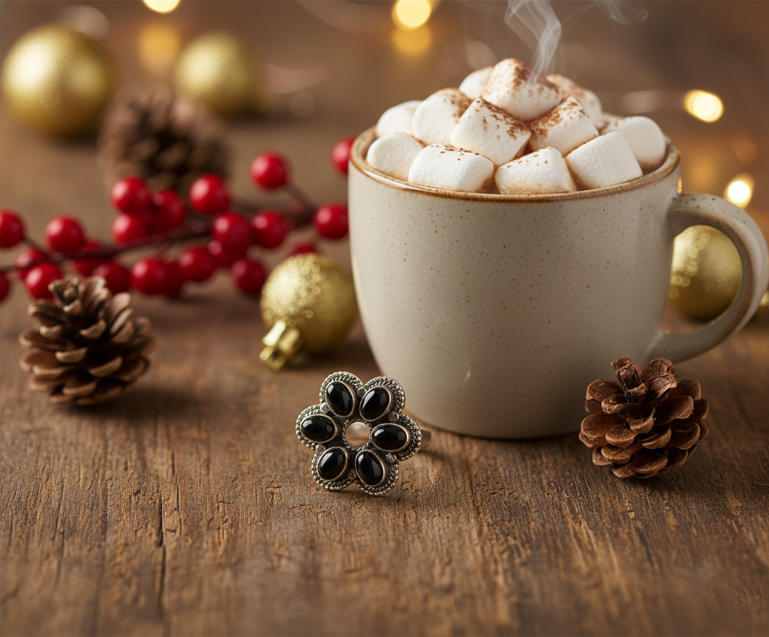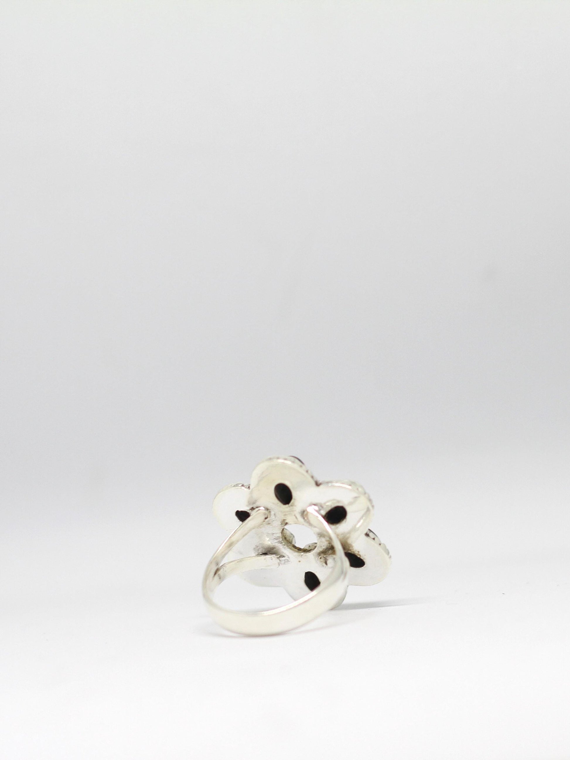 The ring's band is sleek and understated, complementing the intricate floral design. Details: Gemstones: Black onyx Setting: Silver Band: Silver Style: Floral, Vintage-inspired Shape: Flower Additional Notes: The black gemstones add a touch of mystery and sophistication to the ring.