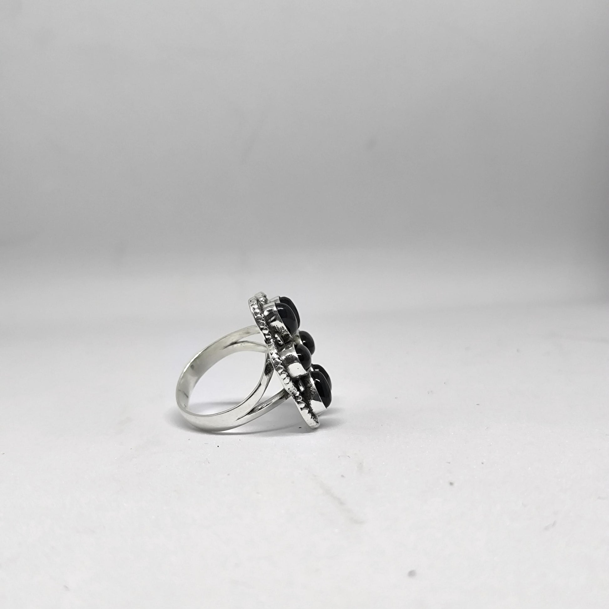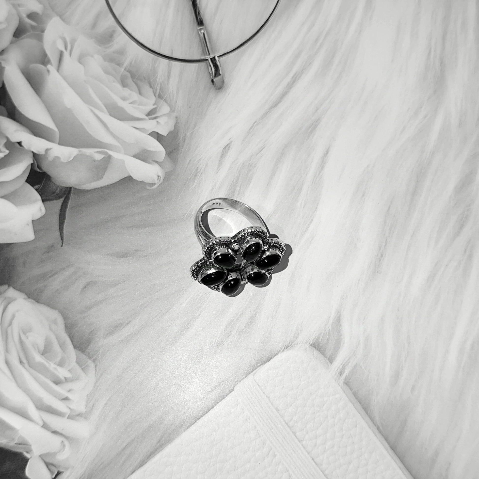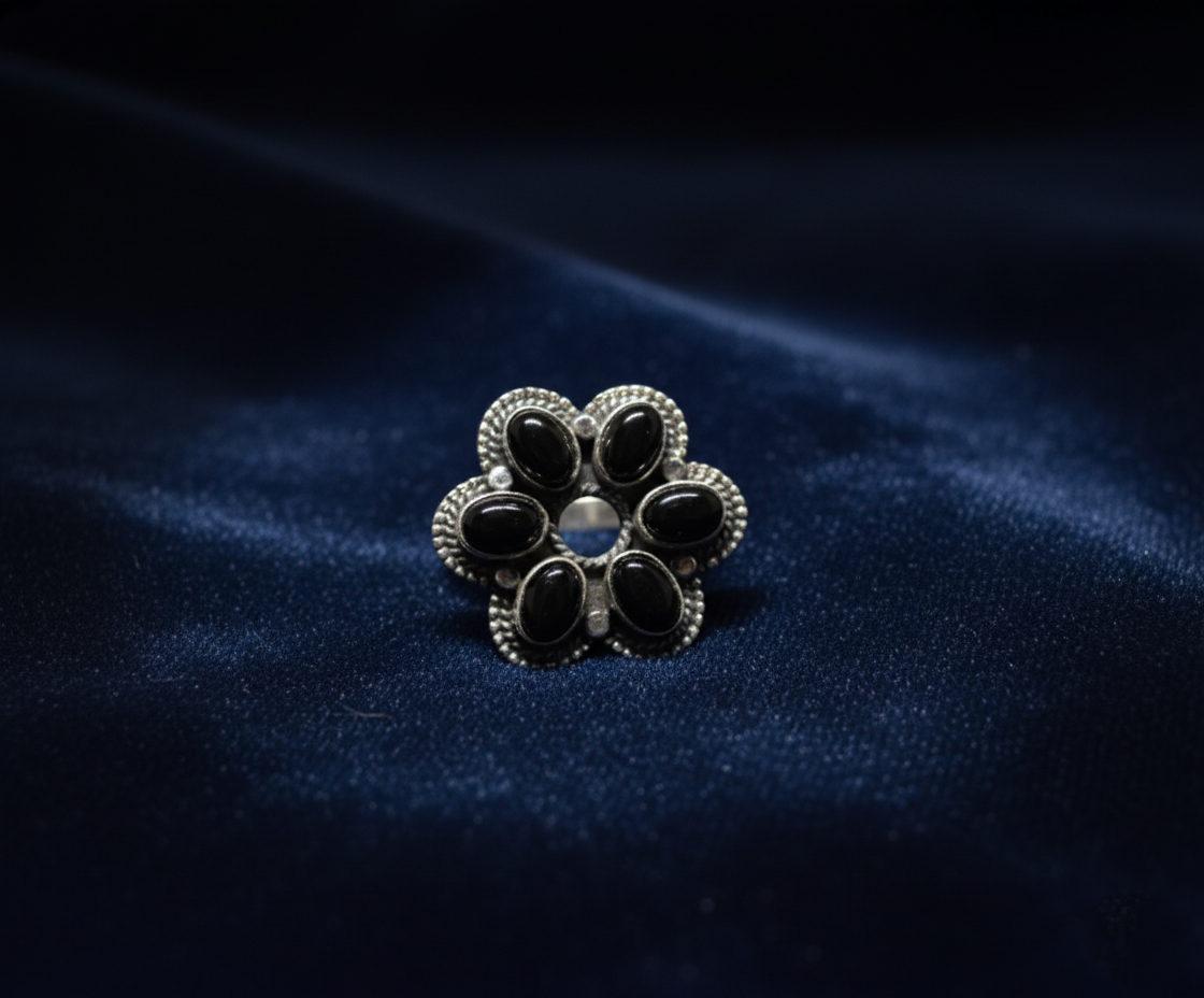 This elegant ring features a captivating floral design, crafted with meticulous attention to detail. The center of the flower is adorned with a cluster of seven oval-shaped black gemstones, possibly onyx, creating a striking contrast against the silver setting.