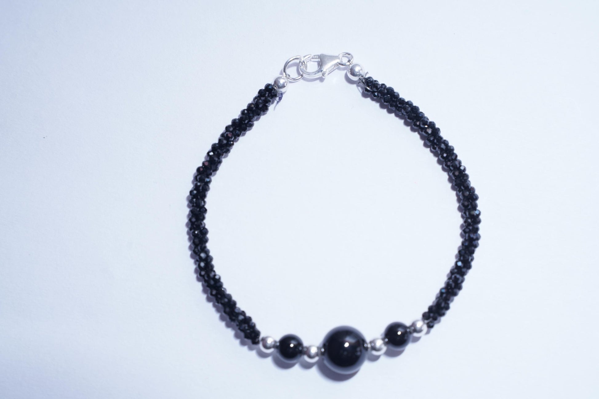Materials: Genuine Black Spinel, Sterling Silver (clasp and spacer beads).