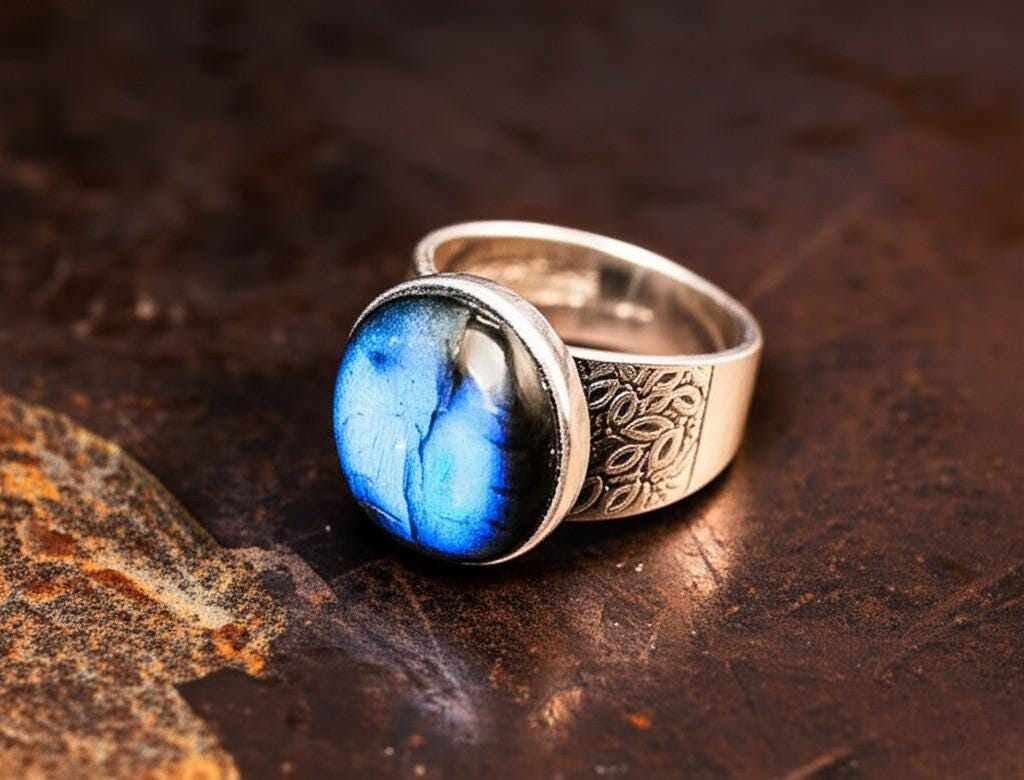 Blue Gemstone Ring | Sterling Silver Band with Engraved Pattern | Oval Cabochon Statement Ring | Handmade Artisan Jewelry | Gift for her