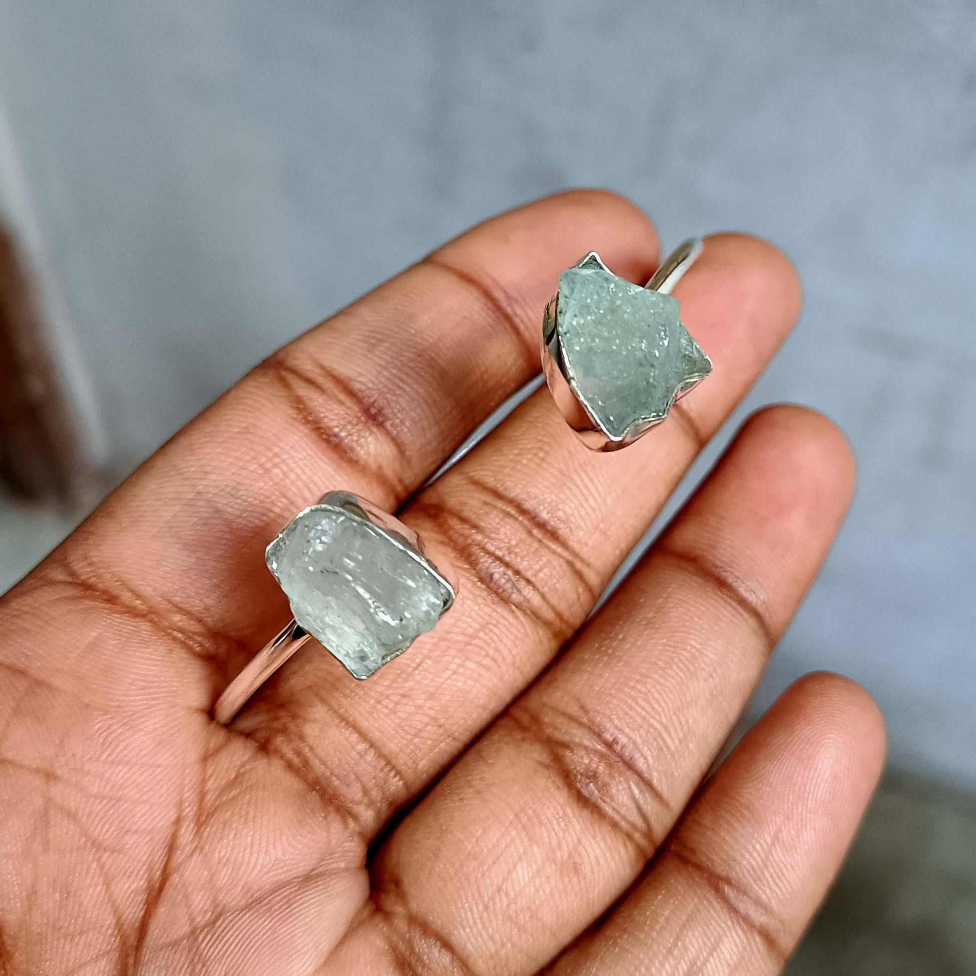 This beautiful aquamarine bangle in sterling silver is carefully handcrafted, featuring two natural raw aquamarine stones set at each end of a sleek silver cuff. With its fresh blue tones and minimalist design, this bracelet combines elegance with a touch of natural charm.