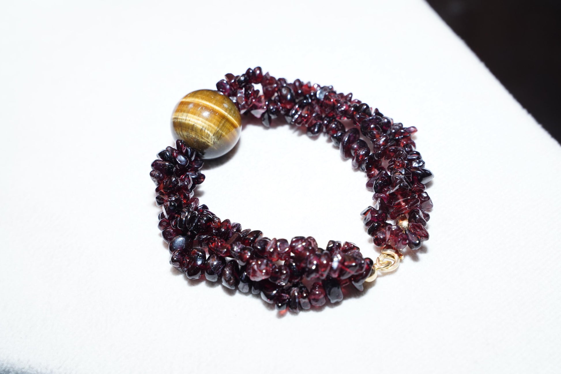 Embrace natural elegance with this striking handmade bracelet, featuring the deep, fiery hues of natural garnet chips and the captivating gaze of a central Tiger's Eye bead. Multiple strands of rich red garnet create a beautiful texture and depth, while the polished, spherical Tiger's Eye bead provides a warm, golden-brown contrast with its characteristic chatoyancy