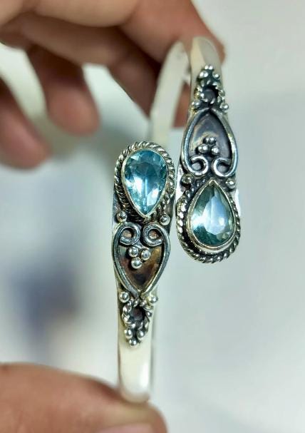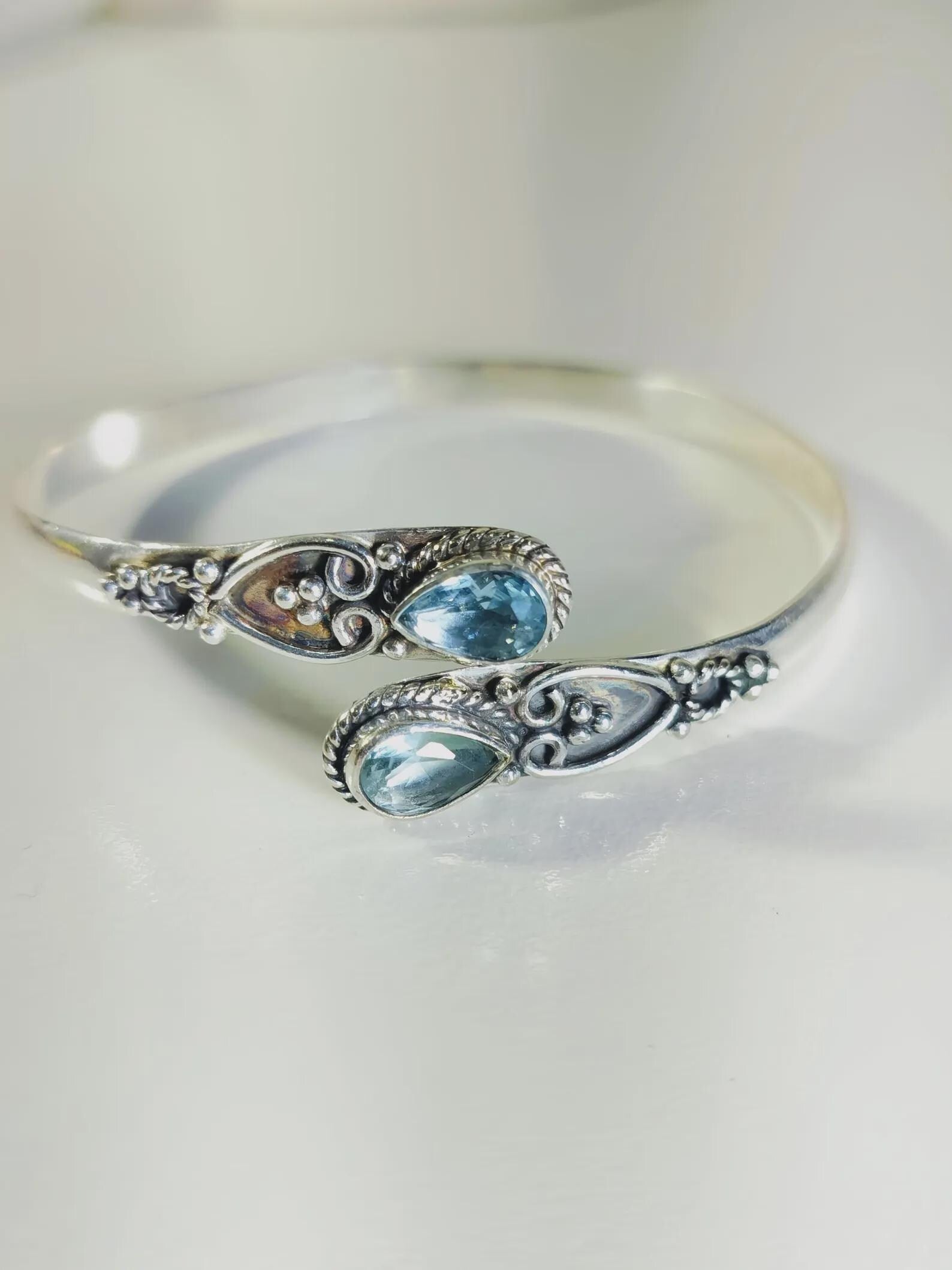 Handcrafted sterling silver bangle featuring two shimmering blue topaz stones in teardrop and oval cuts. This adjustable cuff bracelet blends boho charm with vintage elegance, making it a perfect statement piece or thoughtful December birthstone gift.