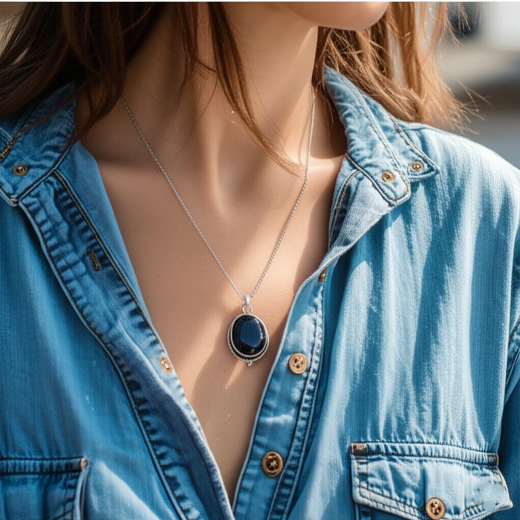 Imagine wearing a pendant that embodies the night sky. The Midnight Onyx Pendant offers a captivating blend of darkness and light, with its deep black color and shimmering silver frame.