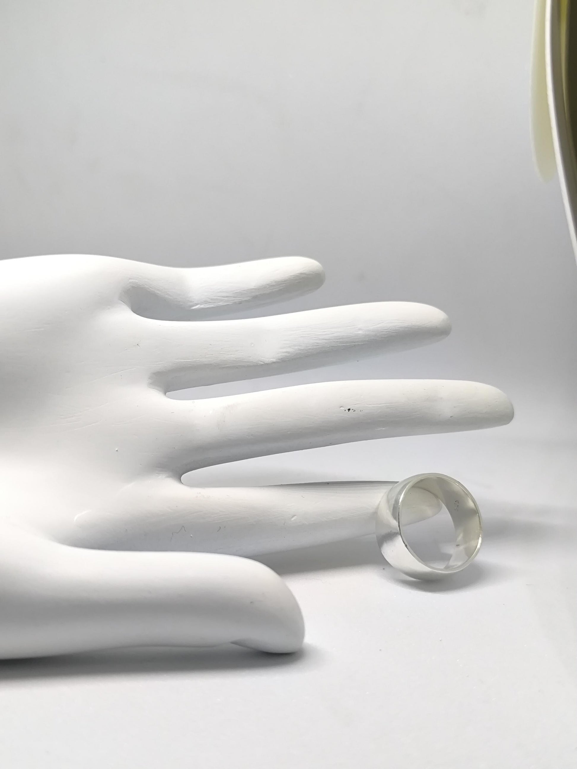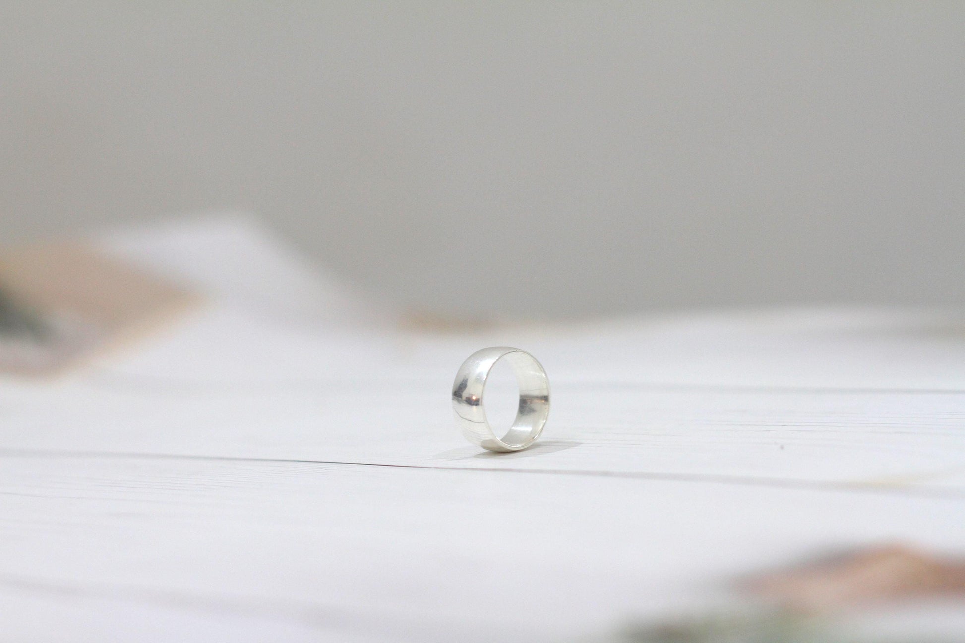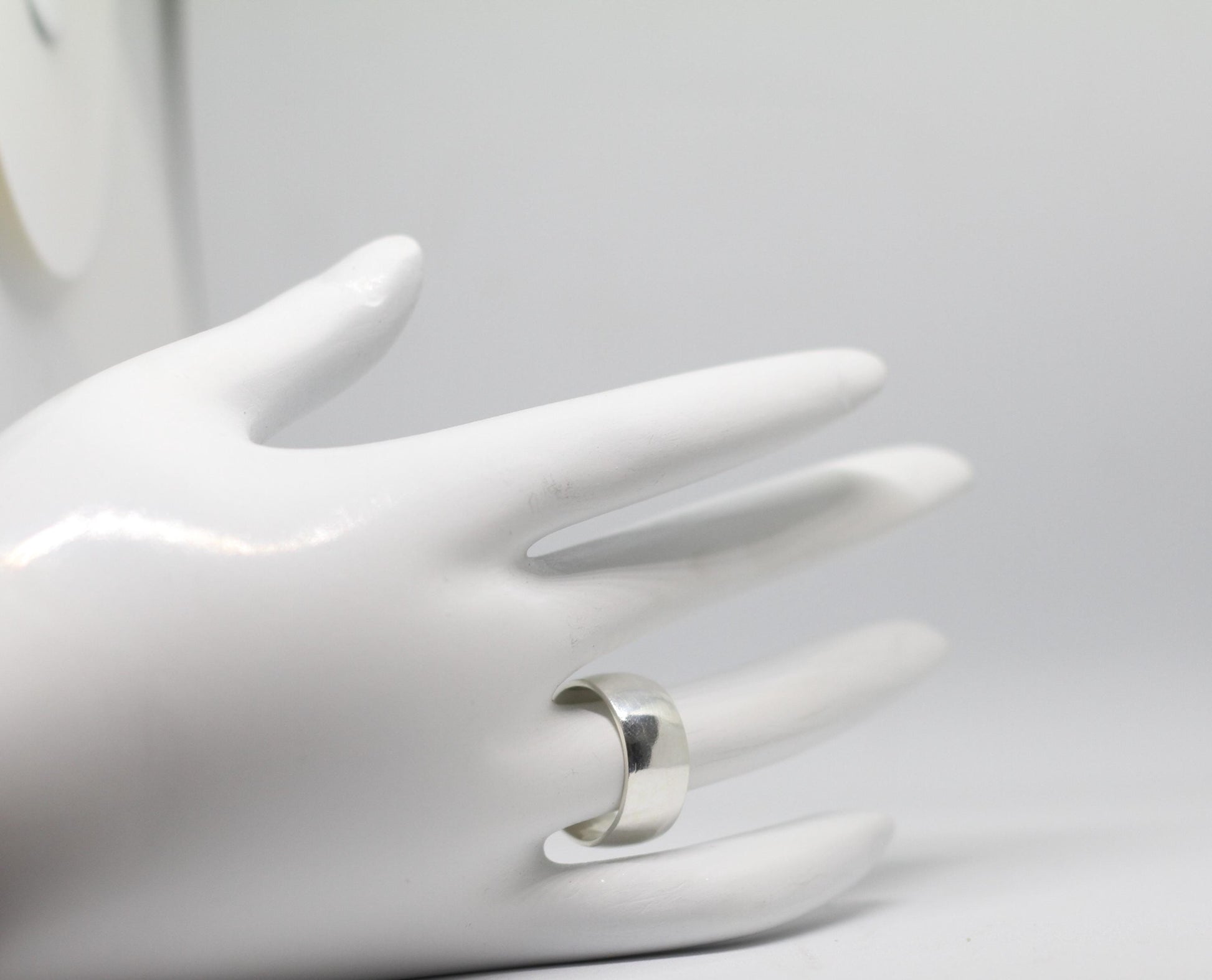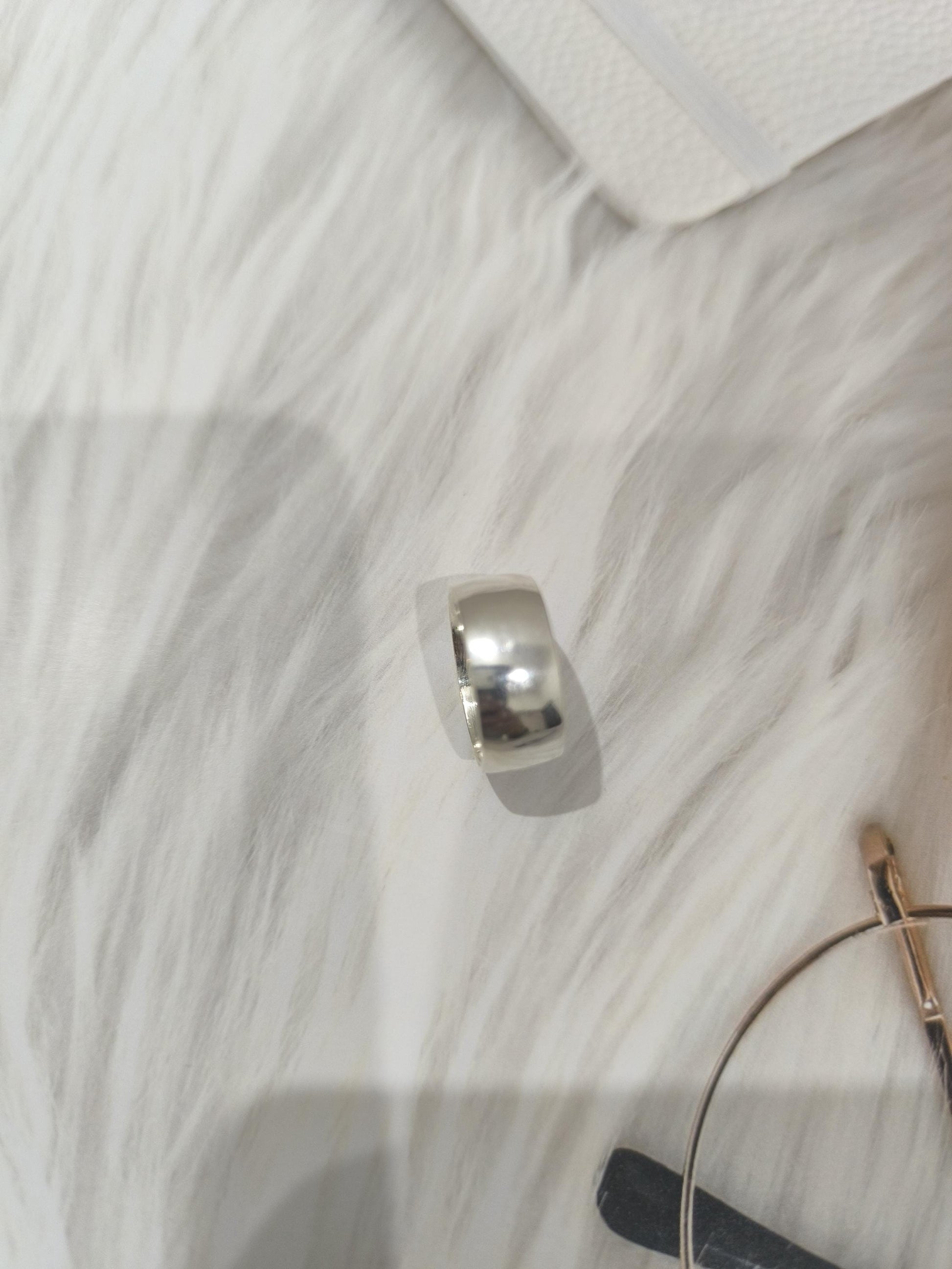 The ring is a classic, simple band style. It appears to be made of silver, possibly sterling silver, given the bright, reflective surface. The band is of a substantial width, giving it a bold and modern look.
