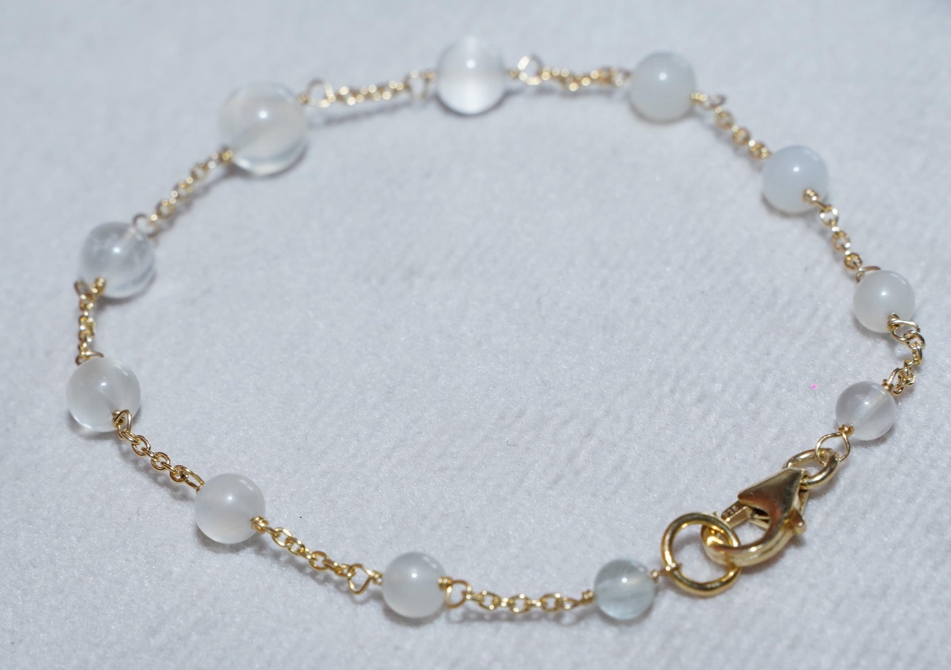 Featuring genuine moonstone beads, each one a unique expression of nature's artistry. The gentle glow of the moonstone, combined with the minimalist gold-plated chain, creates a piece of jewelry that is both elegant and effortlessly chic.