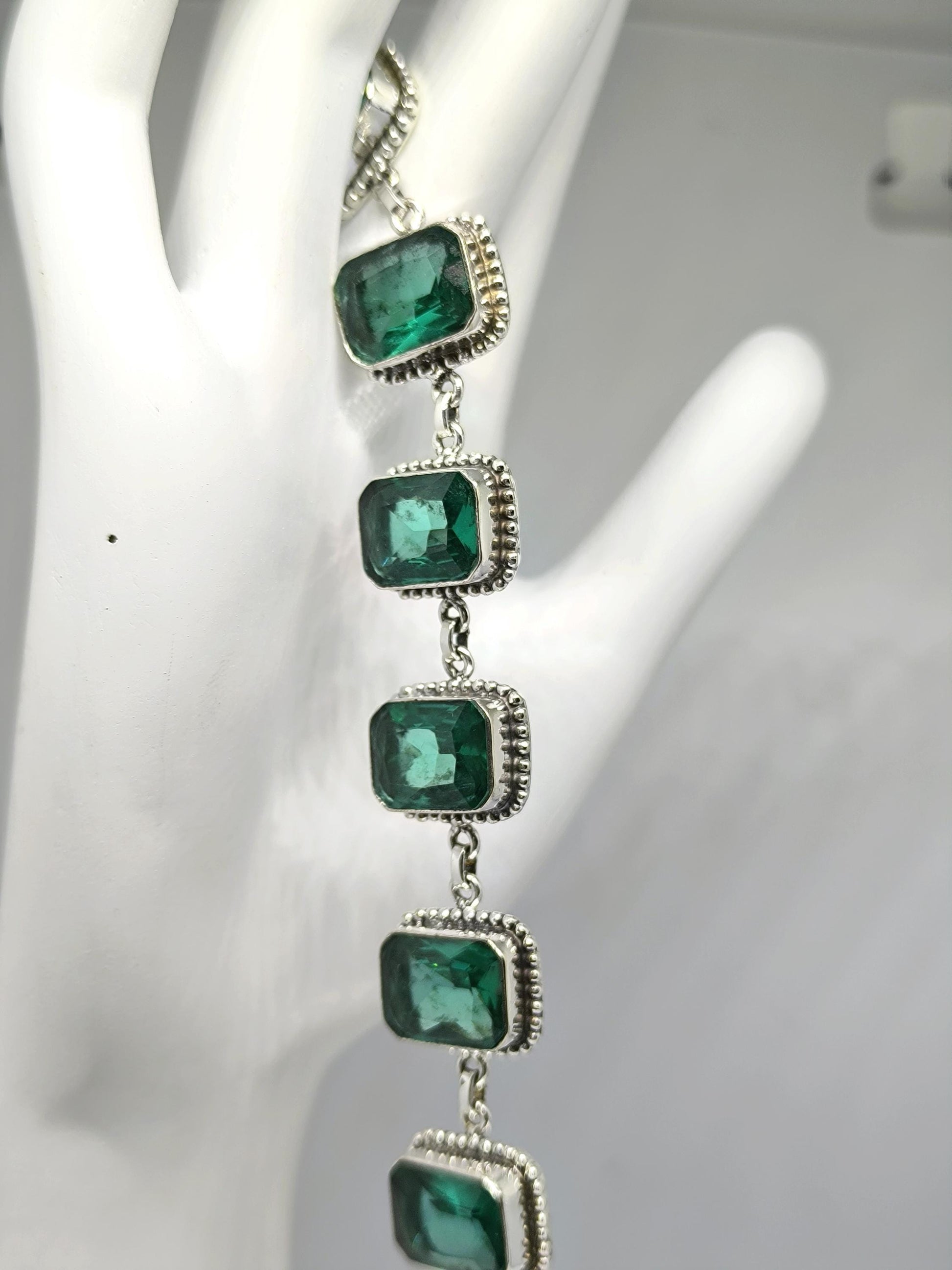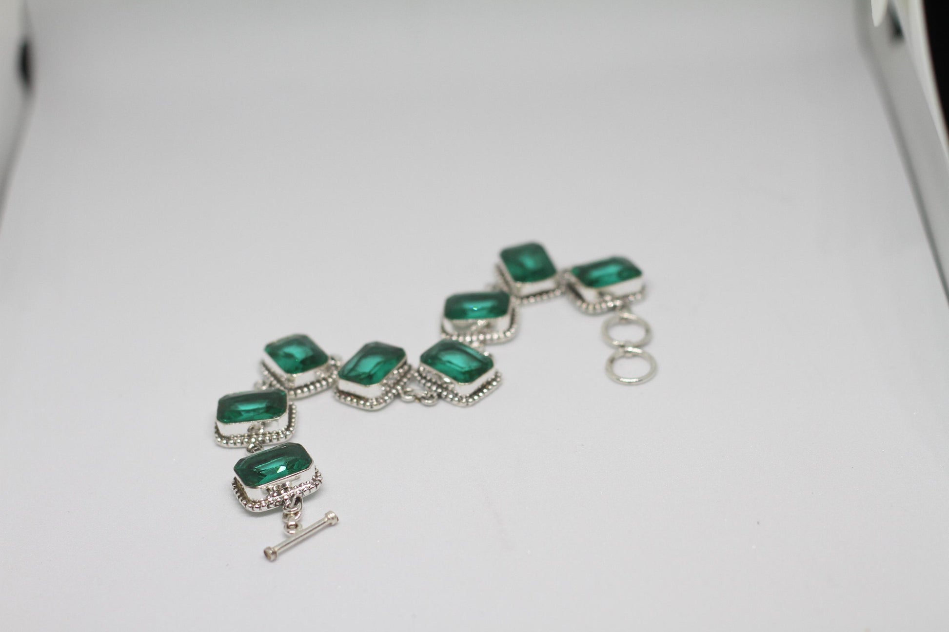 This elegant bracelet features a stunning array of Peridot gemstones set in sterling silver. The rectangular-shaped Peridots are faceted to enhance their natural brilliance. The simple, yet stylish design of the bracelet allows the beauty of the Peridot to shine through. It's a perfect accessory for any occasion, adding a touch of sophistication and color to your wrist.
