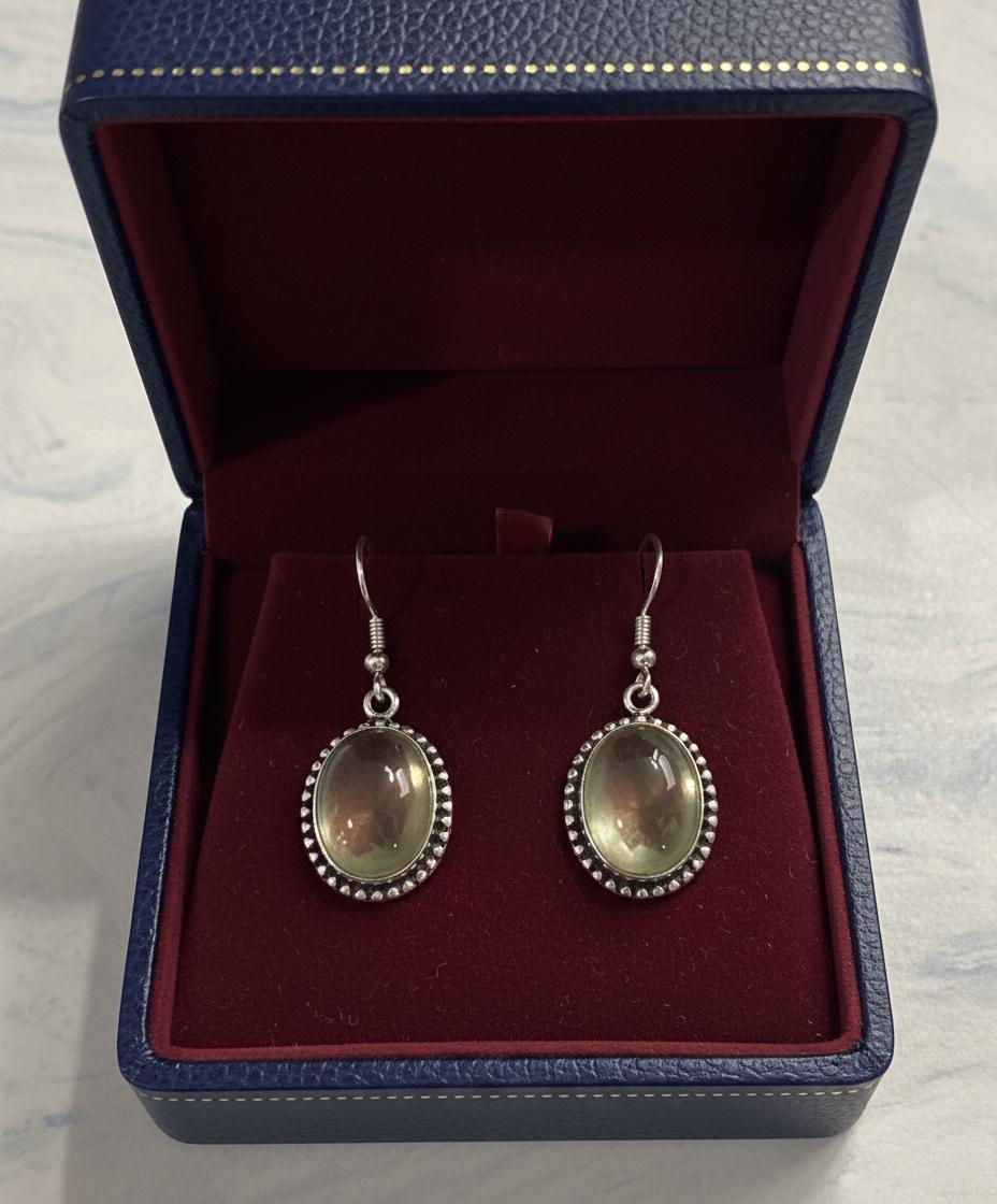 Embrace tranquility with these elegant Prehnite oval earrings. Known for its calming energy, Prehnite is believed to soothe emotions and promote a sense of peace. The delicate oval shape and sterling silver setting create a timeless and sophisticated look.
