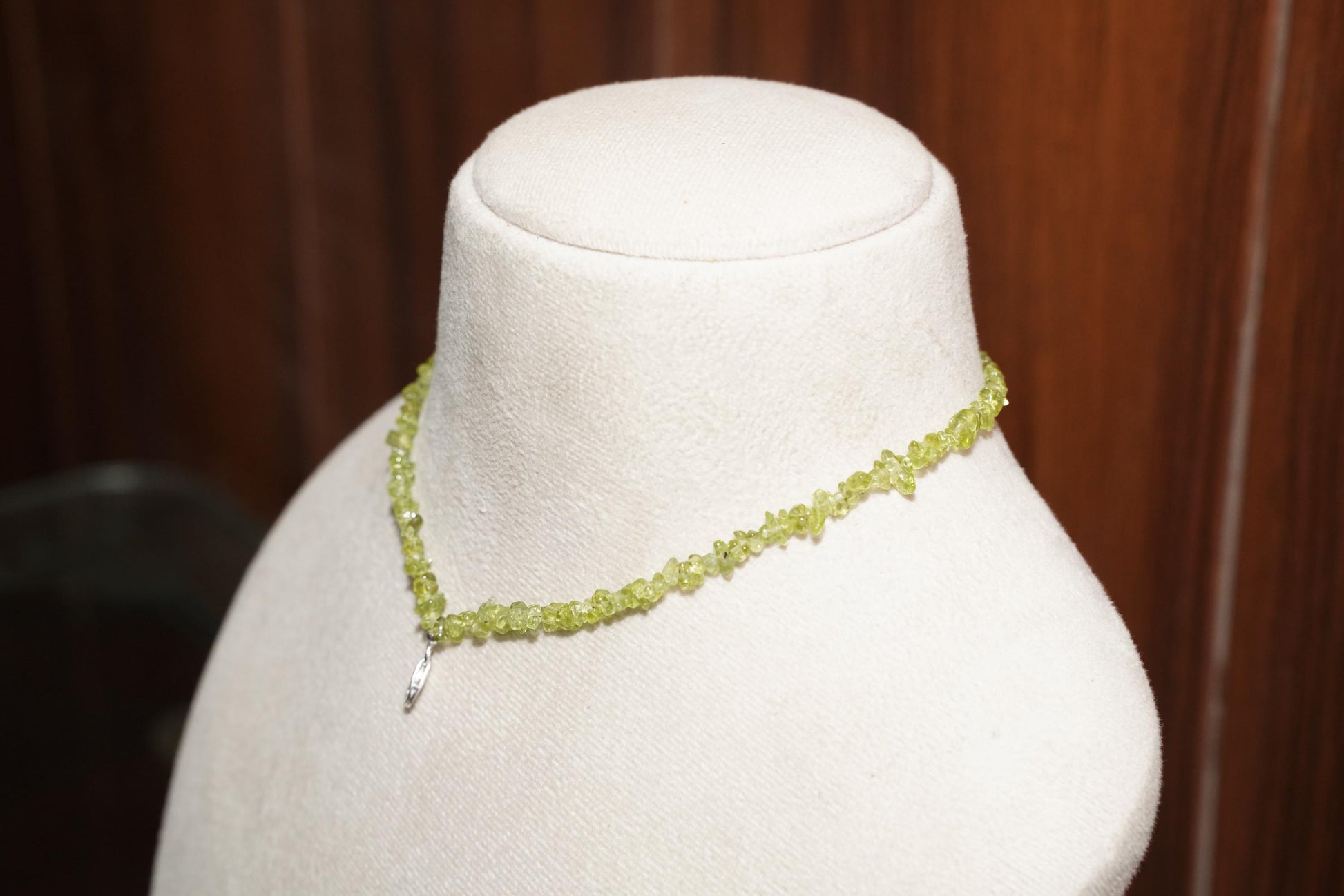 This beautiful raw peridot necklace features countless small, tumbled peridot chip beads strung together to create a delicate and naturally vibrant piece. Perfect for layering or as a simple, minimalist choker, its brilliant green color brings a touch of natural elegance to any outfit.