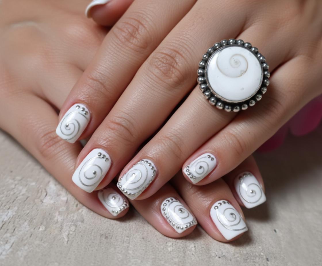 The Shell: The centerpiece is a genuine Shiva Eye Shell, identifiable by its stunning, natural white spiral pattern that evokes a sense of protection and the cyclical nature of life. The shell has been highly polished, giving it a luminous, milky white color.