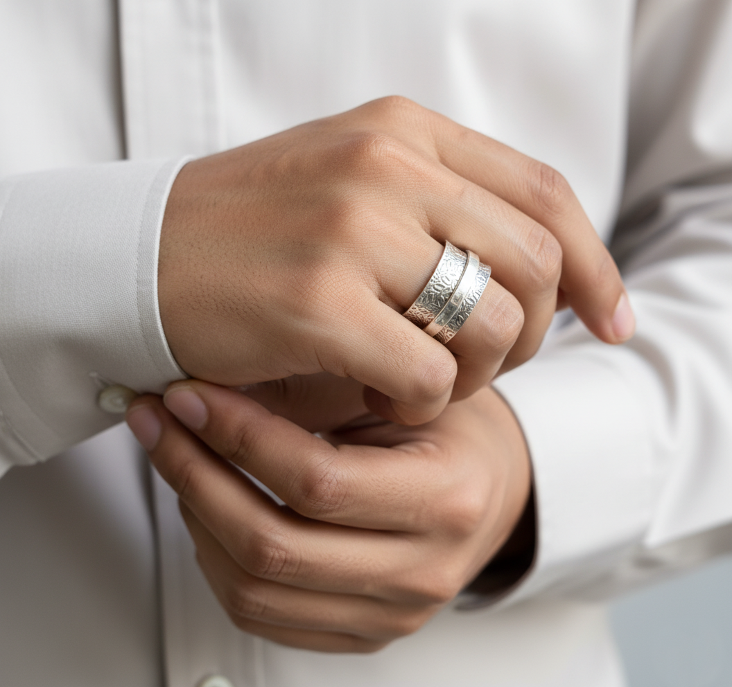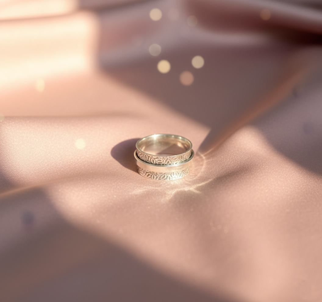 Find your calm in every spin. This beautiful 925 sterling silver spinner ring (also known as a fidget ring, anxiety ring, or meditation ring) features a wide textured band with intricate floral engraving and a smooth spinning outer band that glides effortlessly – perfect for stress relief, mindfulness, or simply when you need a moment of peace.