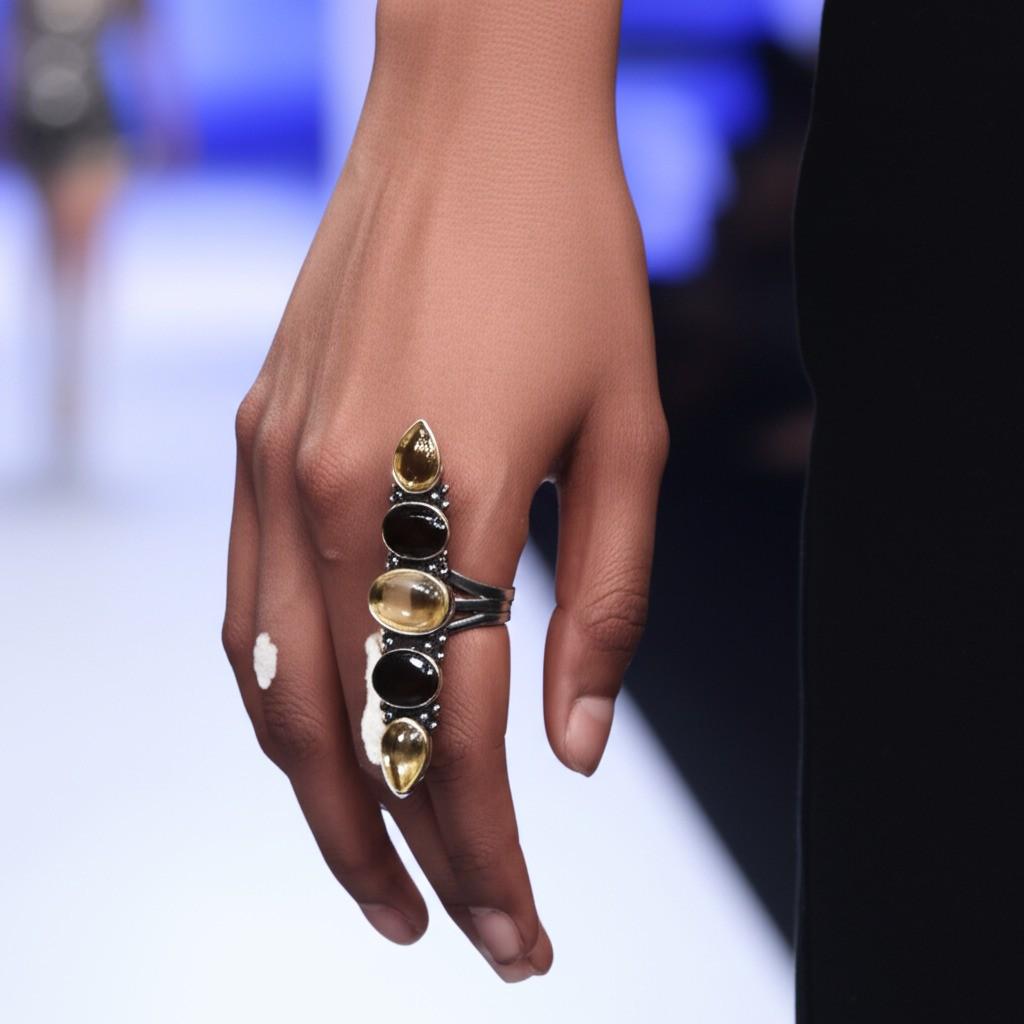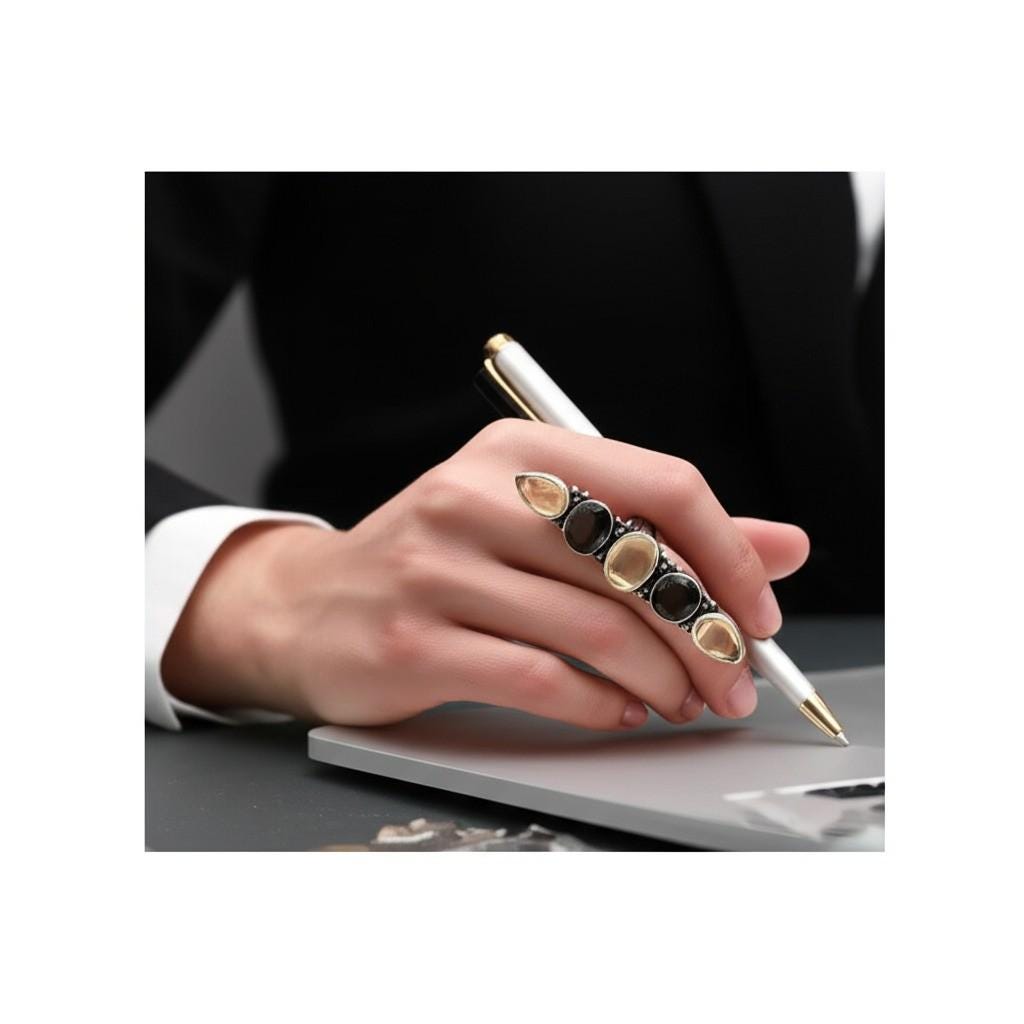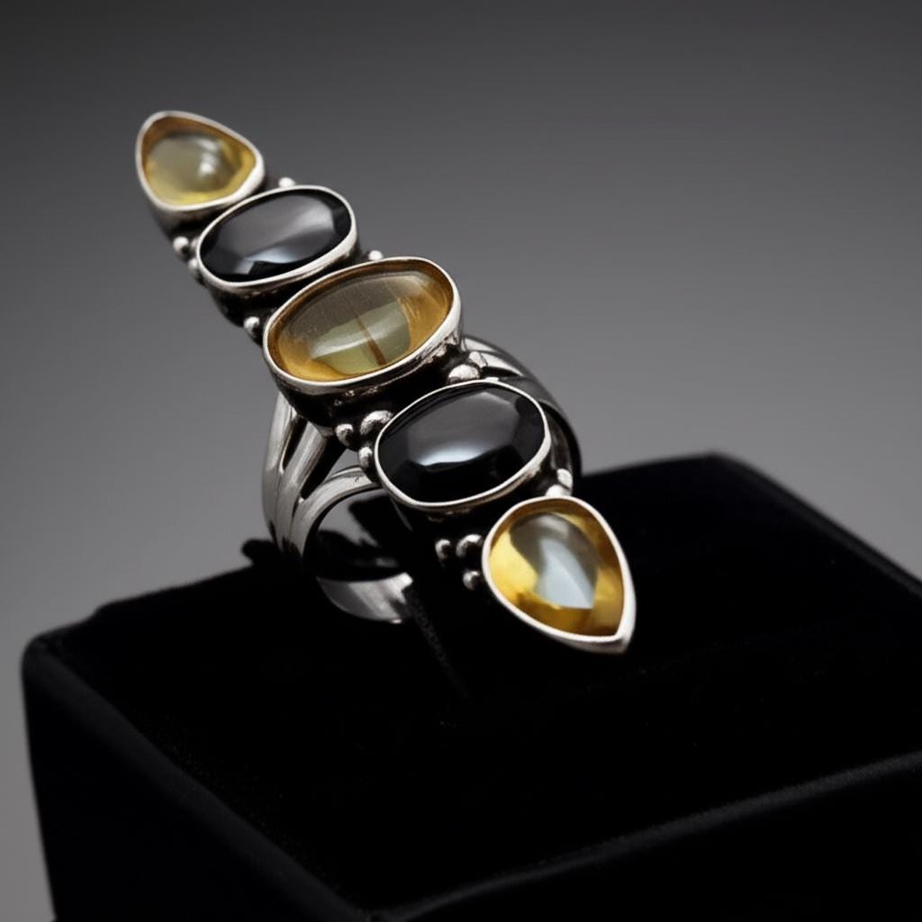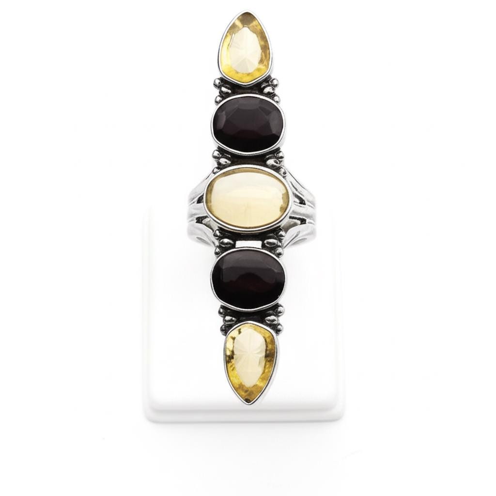 Embrace organic elegance with our "Cascading Earth Tones" ring. This captivating piece features a unique vertical arrangement of five natural gemstones, each carefully chosen to create a harmonious blend of earthy hues. Two alluring teardrop-shaped stones anchor the design, complemented by three exquisite oval-cut gems, creating a graceful cascade of color and light.