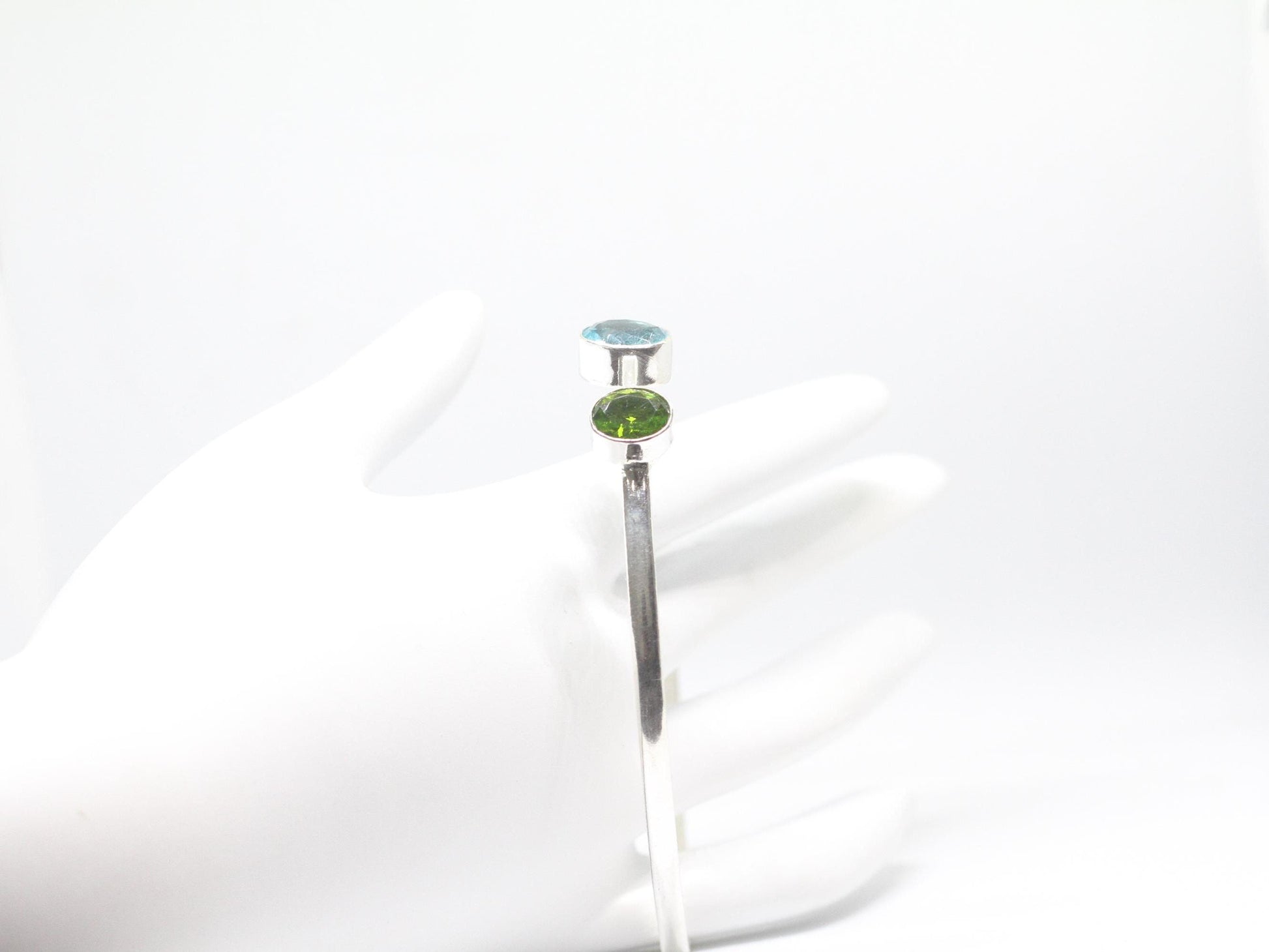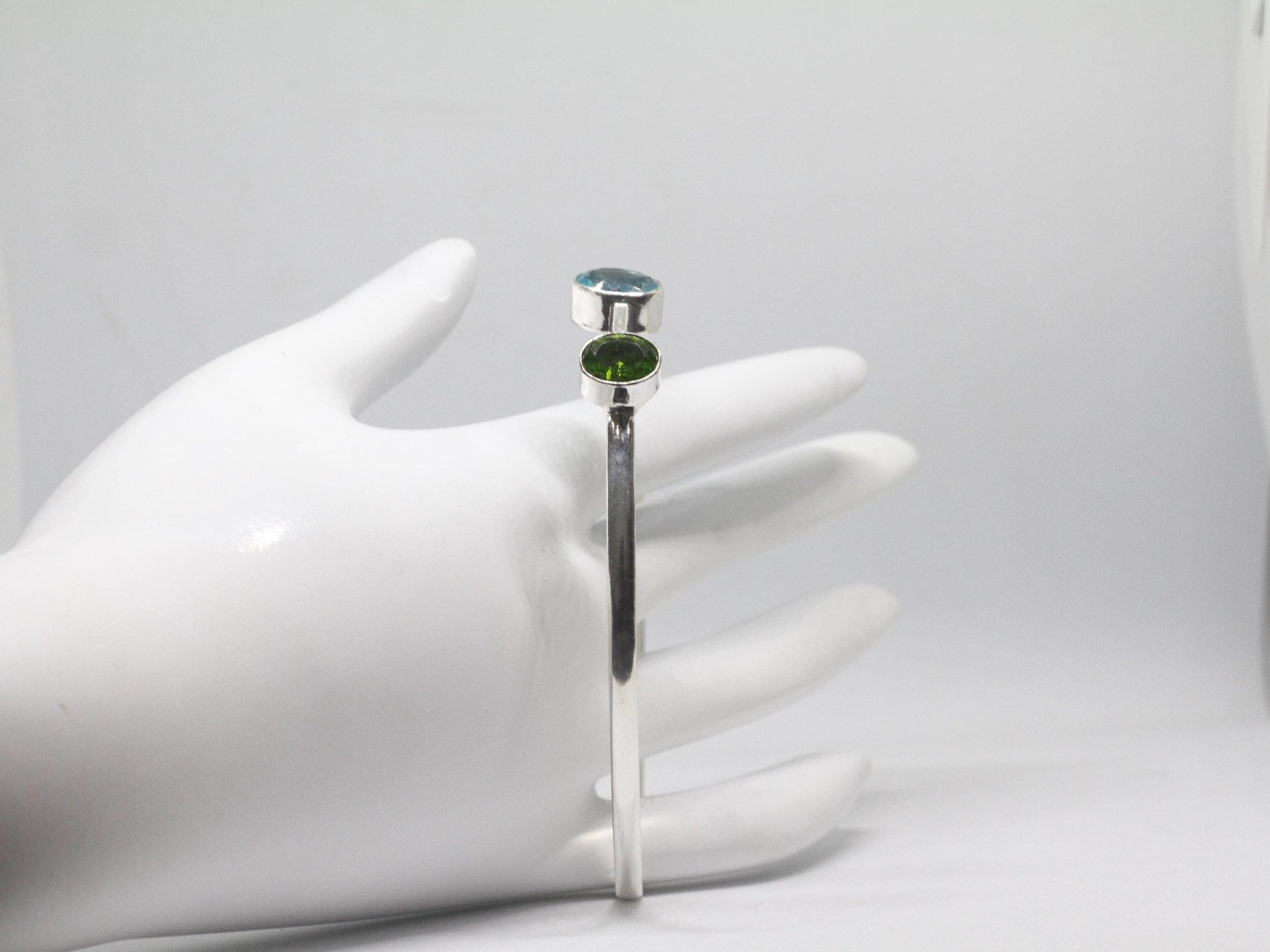 This delicate sterling silver bangle features two vibrant gemstones, a captivating blue topaz, and a rich peridot, set gracefully on either side. The minimalist design and contrasting colors make this bangle a versatile piece that can be dressed up or down. It's perfect for adding a touch of elegance and personality to any outfit.
