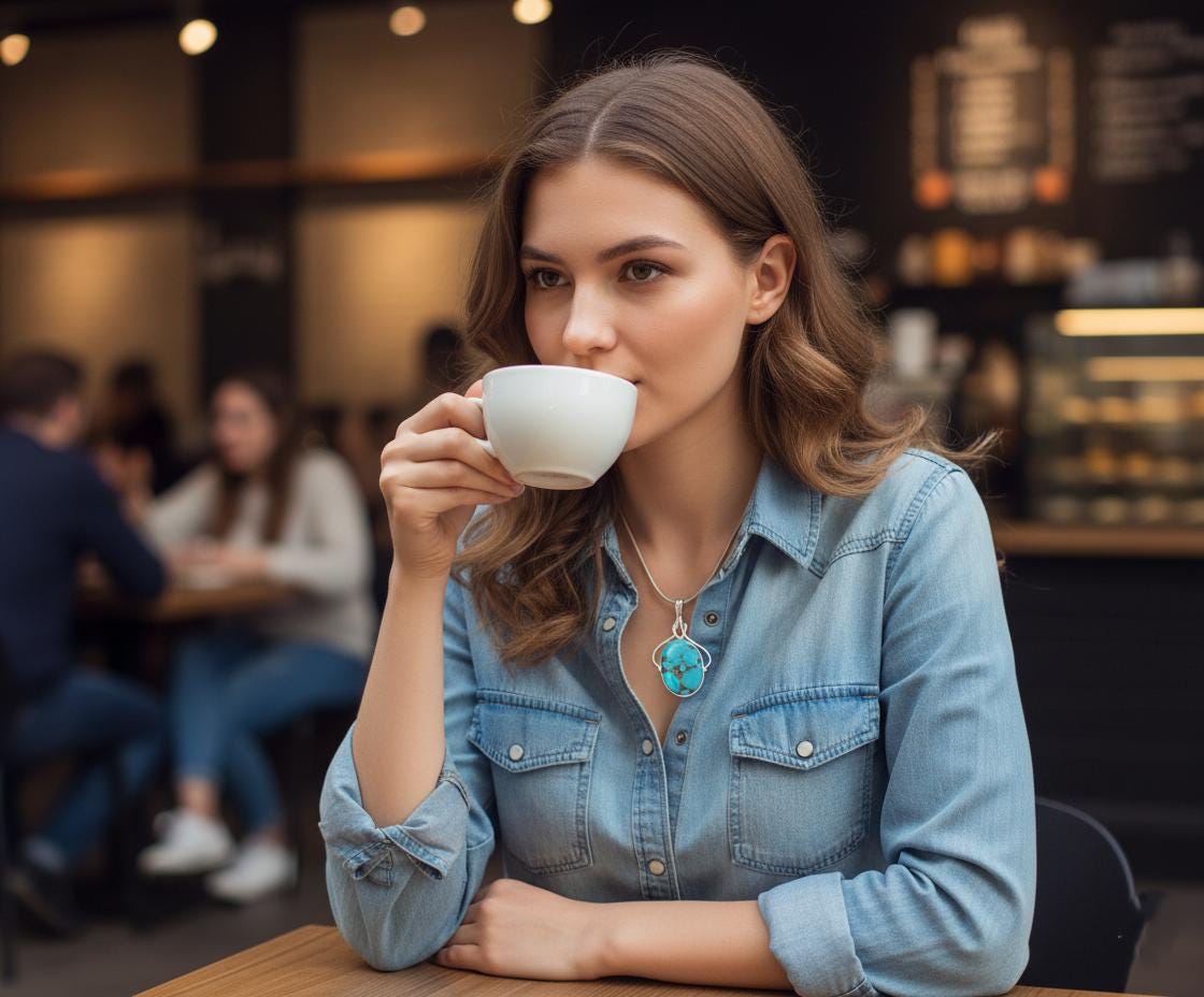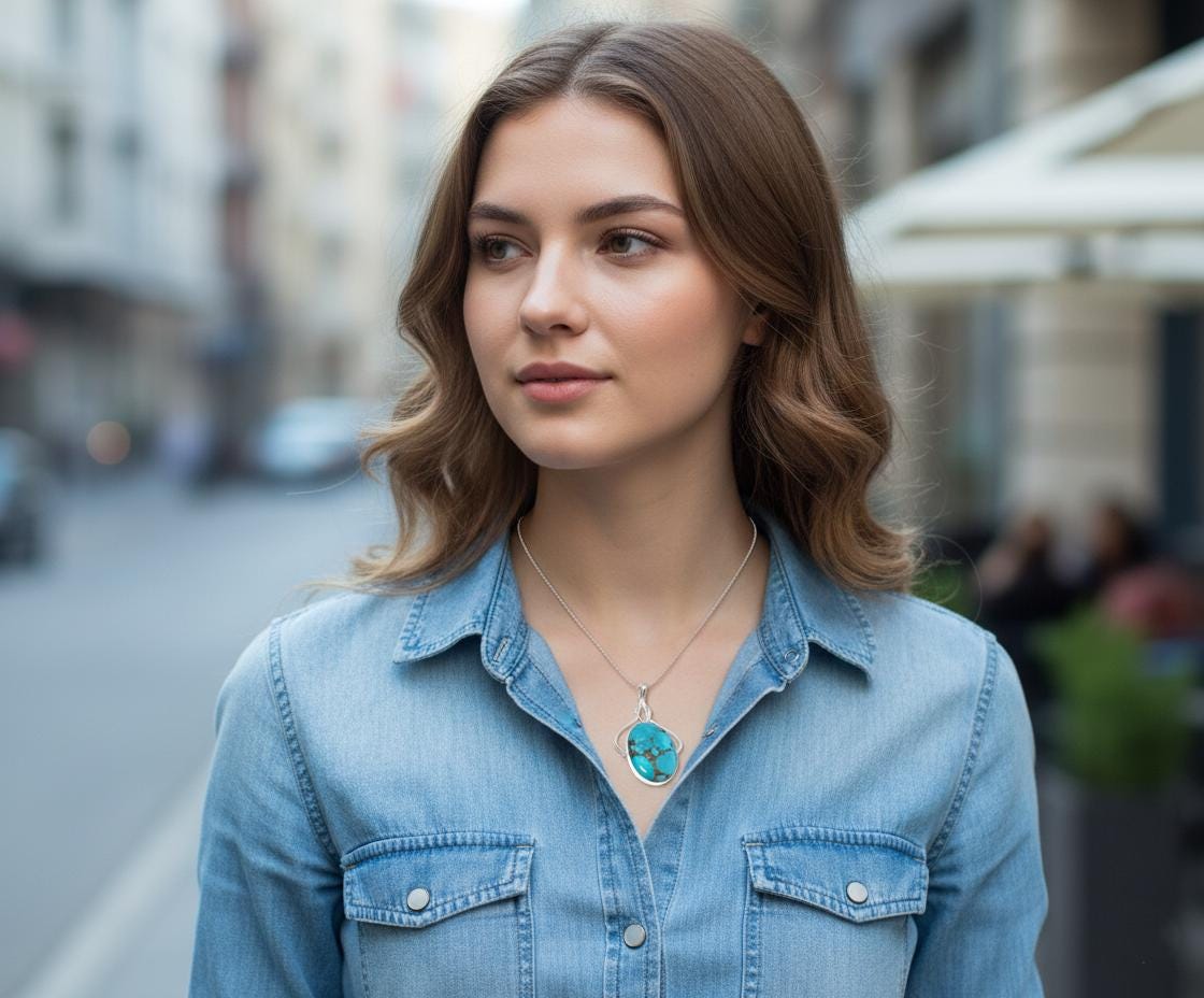 This elegant turquoise pendant is carefully handcrafted in 925 sterling silver and features a stunning natural turquoise gemstone with unique matrix patterns in earthy brown veins. The vibrant blue-green color of turquoise has been cherished for centuries as a stone of protection, wisdom, and positive energy.